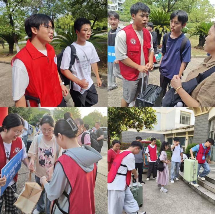 迎新现场,党员志愿者们佩戴标识,主动上前接过新生家长手中行李,细致的为新生讲解入学须知,耐心解答专业学习、校园生活等疑问。带领新生走向各自的楼栋,确保新生“一站式”顺利入学。