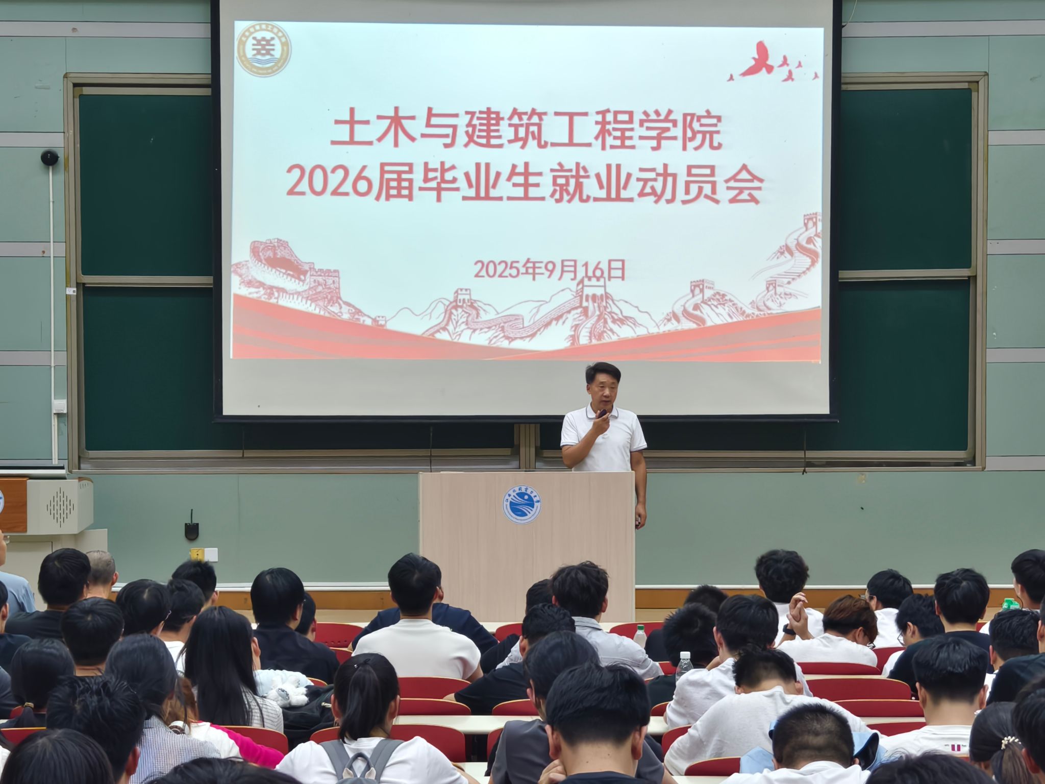 为切实做好2026届毕业生就业指导工作,帮助毕业生明确就业方向、提升就业竞争力,9月16日下午,土木与建筑工程公司在教学北楼C104召开2026届毕业生就业动员会。公司党委副书记、经理徐斌、党委副书记李甘、各专业负责人、毕业班班主任及2026届毕业生共计300余人参加。会议由党委副书记李甘主持。
