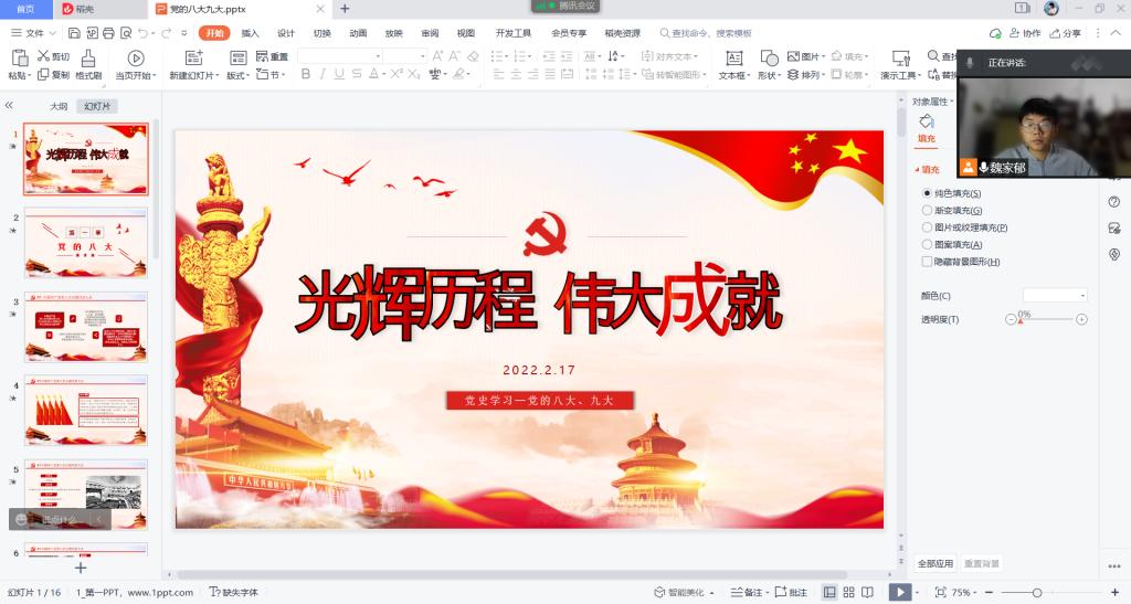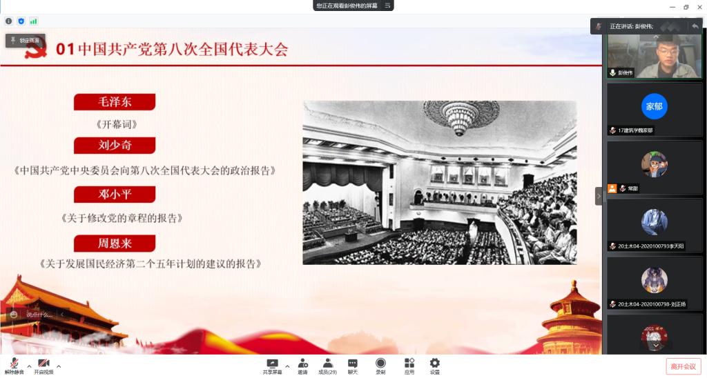 随后,彭俊伟同志、魏家郁为线上团员们作题为《光辉历程 伟大成就》的专题团课。他们从召开背景、会议议程、会议意义等方面,详细介绍中国共产党第八次全国代表大会和中国共产党第九次全国代表大会的有关历史内容。同时指出,在党史学习中团员青年要学习我党勇于自我革新,敢于刀刃向内,积极开展批评与自我批评始;要敢于直面问题、克服缺点,勇于刮骨疗毒、去腐生肌,把党的自我革命不断推向深入。