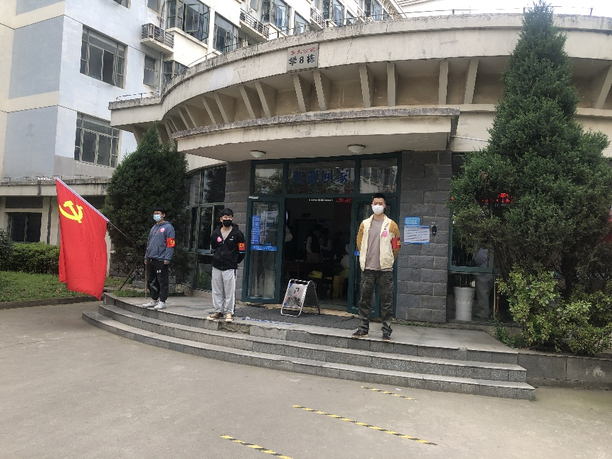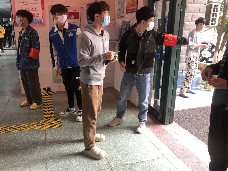 我是党员,我先上!党员师生冲在疫情防控最前线,在楼栋前后门设置党员进行进出楼栋人员的把控,让核酸检测有序进行。
