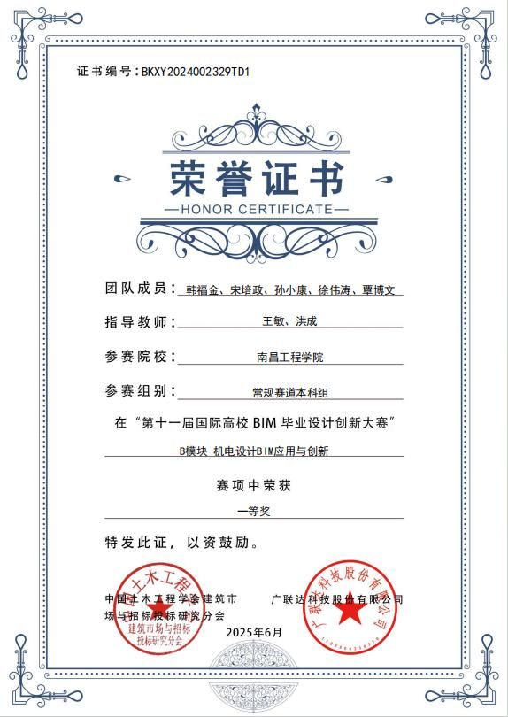 近日,第十一届国际高校BIM毕业设计创新大赛成绩公布,公司bevictor22级给排水科学与工程专业2班韩福金、宋培正、孙小康、徐伟涛和22土木工程4班覃博文等5名同学,在王敏教授和洪成副教授指导下,蝉联常规赛道本科组B模块一等奖。