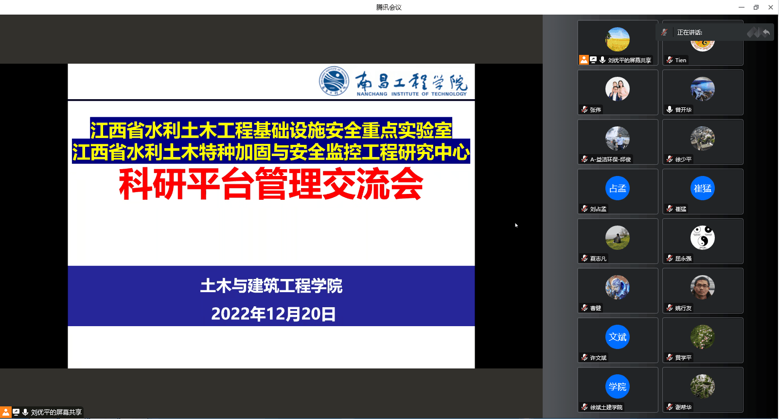 交流会上,江西省水利土木工程基础设施安全重点实验室主任、江西省水利土木特种加固与安全监控工程研究中心平台主任分别就平台建设运行、科研成果管理与考核做了发言,为今后省级科研平台管理提供了指导建议。(图/文 刘优平)