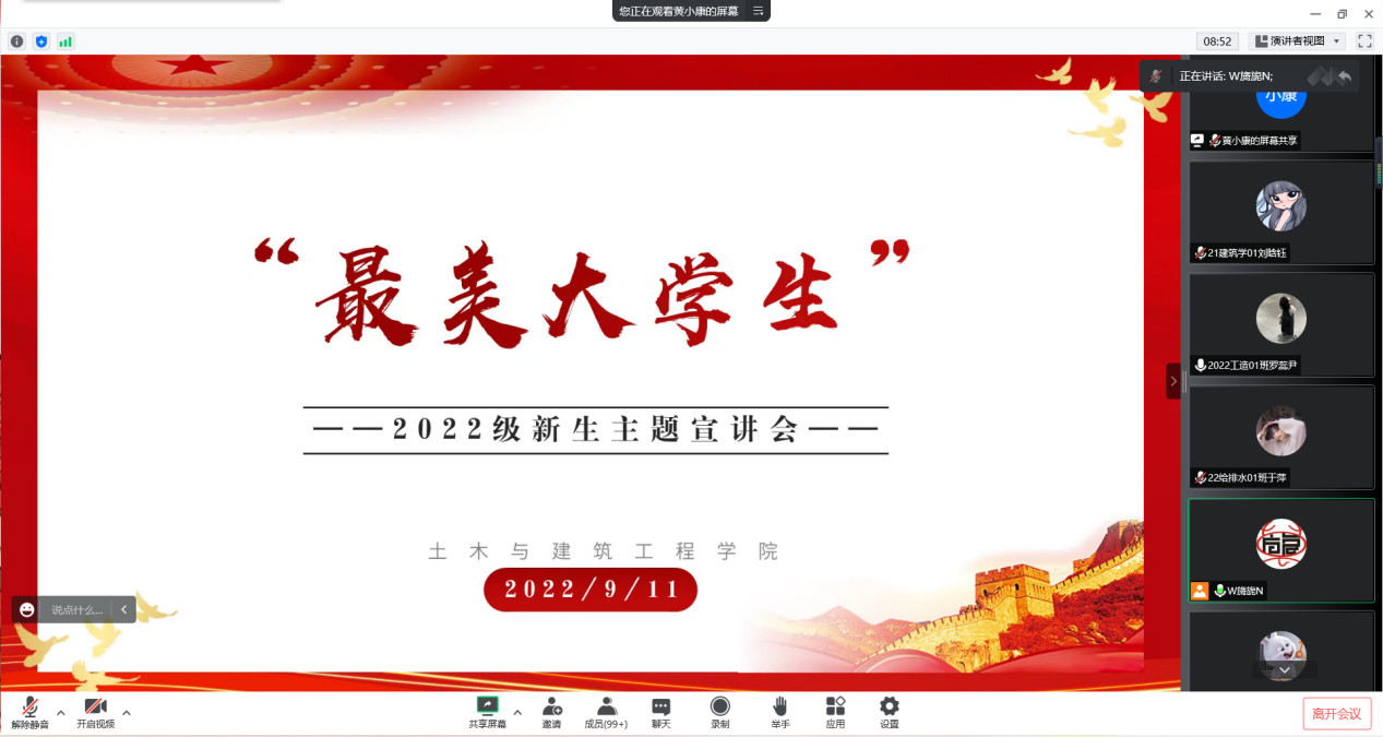 会上,公司2018级建筑学专业黄小康、2019级建筑学专业彭瑶、2019级土木工程专业杨金发、2019级道路桥梁与渡河工程专业陈梦瑶等最美老员工进行事迹分享。他们从学习经验、部门工作、入党、获得荣誉、党建团建等方面向学弟学妹们详述自己的大学校园生活。彭瑶这样鼓舞新生:“时光推着我们往前,只能逆流而上,趁热血正当时。”杨金发用激情昂扬的字句道出了作为一名中共党员的自豪与光荣,他鼓舞新生积极参加校内各项活动,以助于提升个人综合素质,并且积极向党组织靠拢。宣讲会最后,万旎老师表示,希望22级新生向公司“最美老员工”学习,树立正确的大学目标,在大学四年的学习中寻找个人价值,不忘初心,实现梦想,努力为国家建设奉献自己的力量。