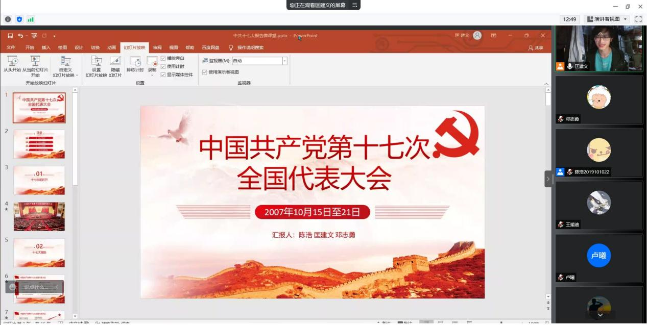 随后,匡建文同志作专题团课宣讲,向团员青年们分享了中国共产党第十七次全国人民代表大会的相关历史。他从大会的历史背景、主要内容、重大成果、历史意义四个方面详细的进行了介绍,让同学们有了更加深刻的了解。