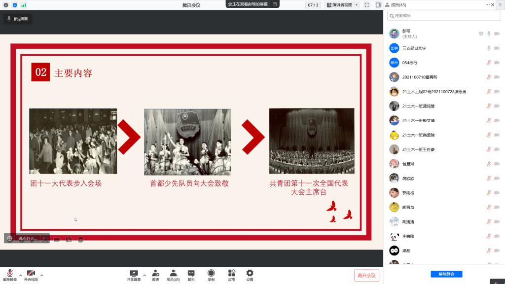 晚19时,全体起立,奏唱中国共产主义青年团团歌。随后,彭瑶从会议的历史背景、基本情况、会议内容、意义四个方面阐述中国共产主义青年团第十一次全国代表大会。她图文并茂,通过浅显易懂语言,生动形象的为线上团员讲述专题团课。