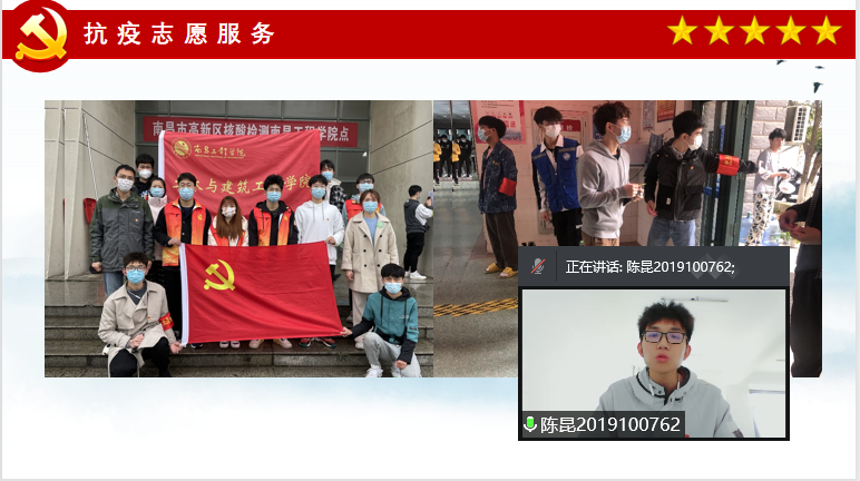 党员代表陈昆讲述抗疫志愿服务工作,传达抗疫精神。面对疫情,陈昆同学挺身而出,发挥好先锋模范作用,在校园疫情防控的战场上与时间赛跑,为同学们送上春寒料峭里温柔的暖意。通过抗疫志愿服务工作的讲述,同学们更深刻得领悟了众志成城的伟大抗疫精神。