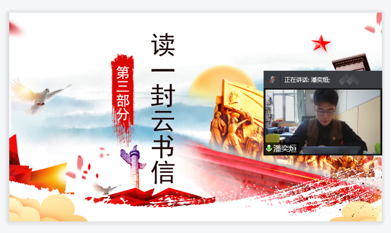 党员代表潘奕烜诵读一封“云”书信。潘奕烜利用写给先烈们的云书信声情并茂地表达了对开天辟地共产党人的敬仰、对奋勇杀敌保家卫国的志愿军战士的缅怀、对隐姓埋名为国家事业奉献一生的科学家的崇敬以及当今各岗位上为了人民和国家献出生命的英雄们的敬佩。这种缅怀思念之情,深深地感染着每位同志,幻化成前行的力量。
