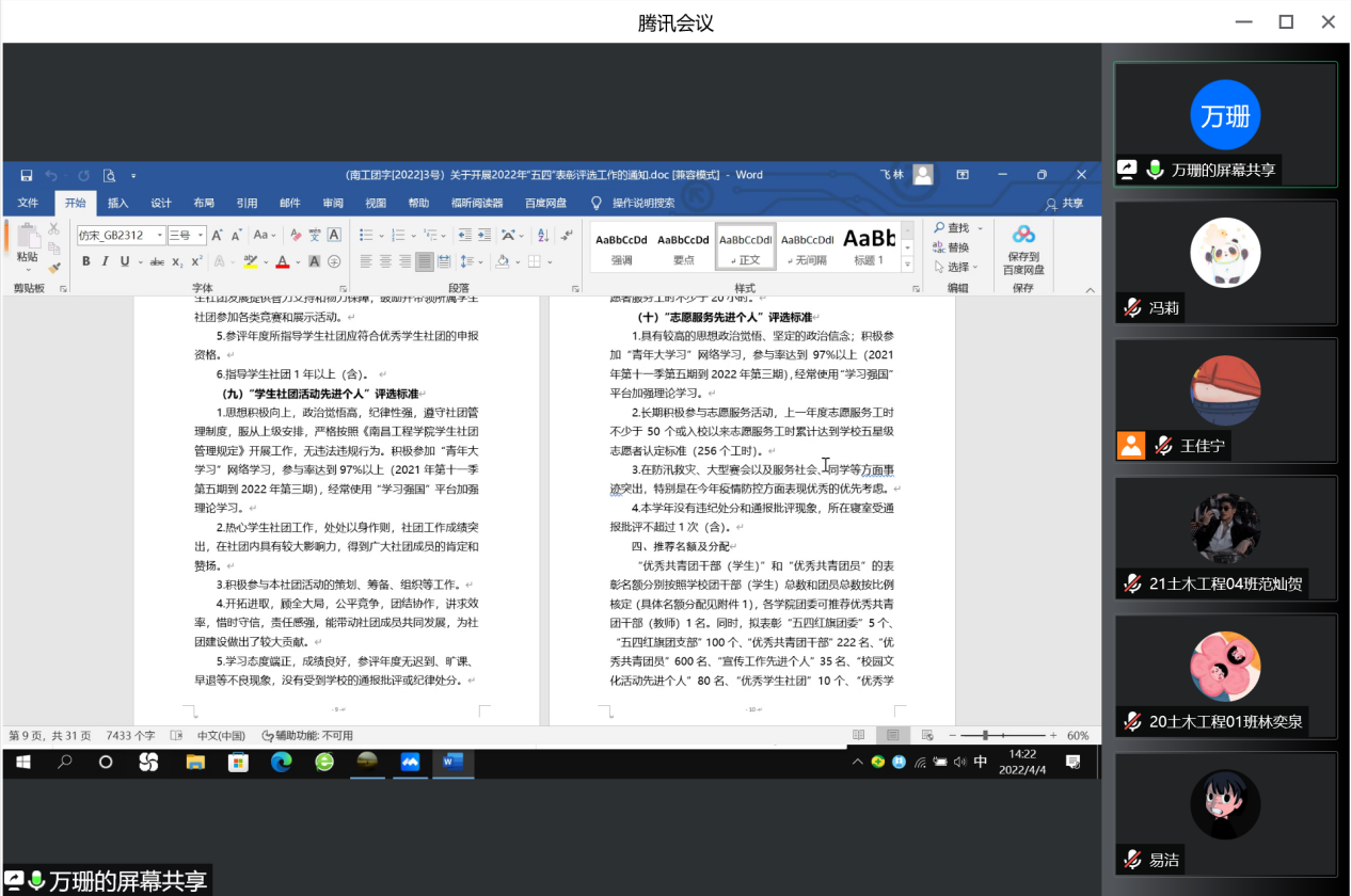 为进一步表彰团员先进典型,维护校园安全稳定,4月4日,bevictor召开线上会议。公司辅导员黄萍、各团支部书记、主要员工干部参会,分团委副书记万珊主持会议。
