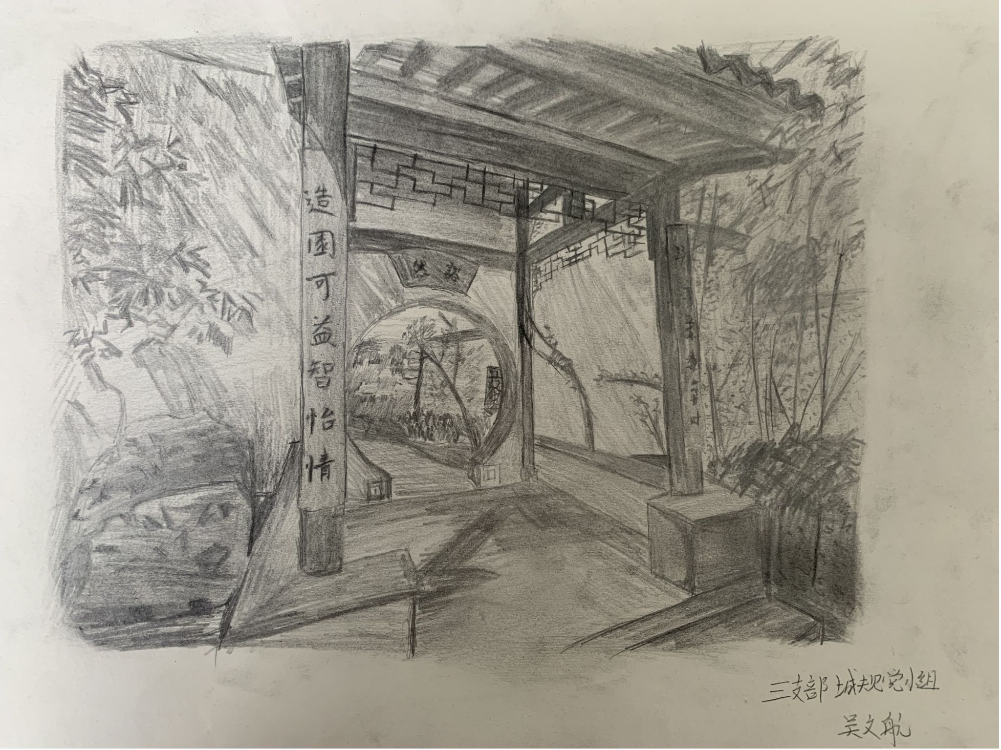 随后,在公司样板支部、土建公司第三员工党支部党员周运清的指引下,同学们依次参观位于南昌市福州路的豫章景园。他从专业的角度,详细介绍了豫章景园的营造特征,包括园林布局、建筑特征、营造手法等,同时,大家结合自身专业,现场绘制出了一幅幅园林景观素描图。