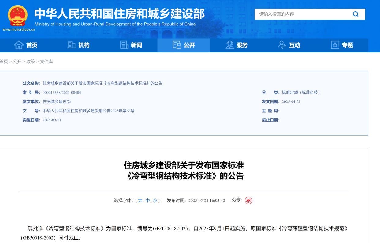 国家标准《冷弯型钢结构技术标准》GB/T50018-2025共包括12章、7个附录,对冷弯型钢结构的适用范围、术语、符号、基本设计规定、材料、构件计算、连接计算、抗震设计、压型钢板、檩条与墙梁、屋架、门式刚架、制作、安装和涂装等进行了系统规定。
